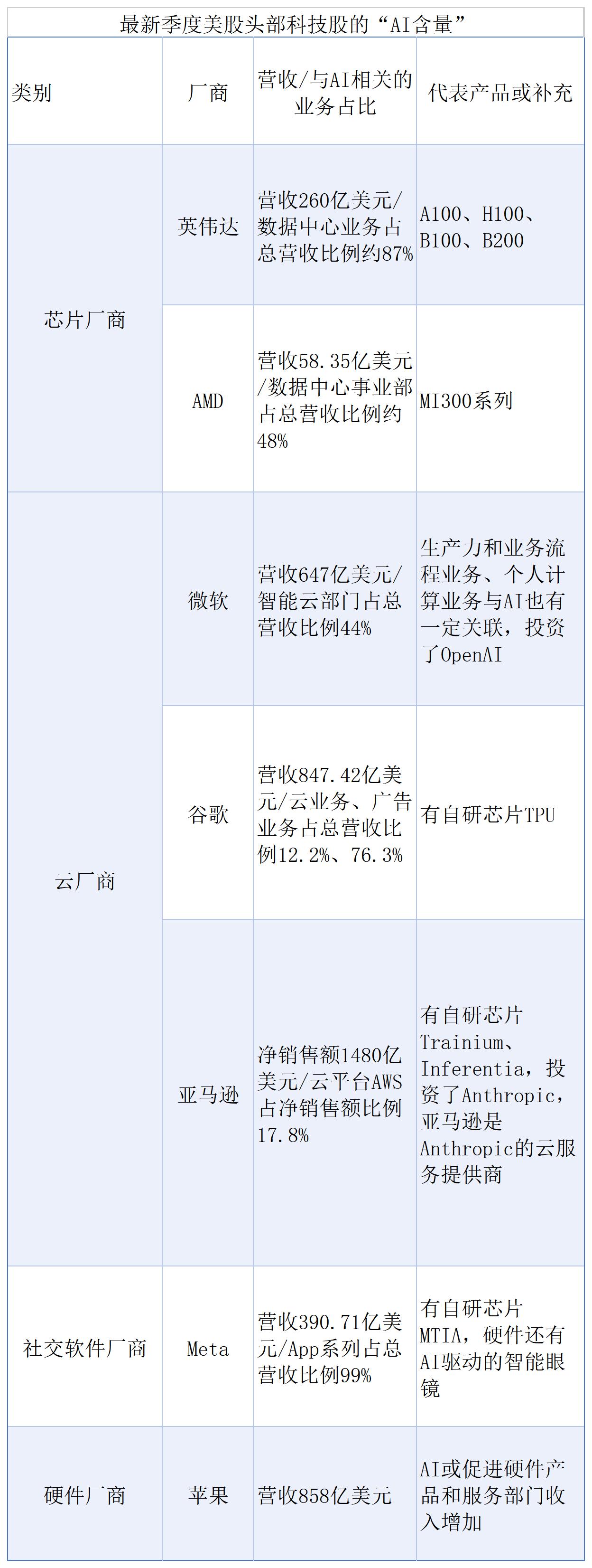微软、谷歌、亚马逊可划为云厂商阵列。从云业务占比看,微软与AI的关联可能是最强的,谷歌和亚马逊的云业务营收占比偏低。云业务之外,这几家厂商其实另有“主业”,虽然部分业务也与AI有一定关联,但AI具体拉动了多少收入增长仍是疑问。